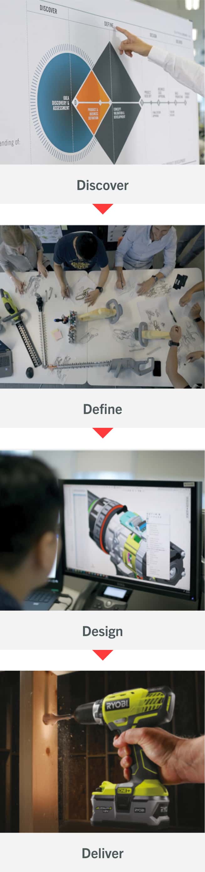 Creating and launching new products at TTI is a strategic and rigorous process that ensures high quality, game changing technology and innovative products. Our process, broadly defined in the four phases of discovery, define, design and delivery, connects user insights with brand, technology and leading-edge cordless solutions. Our world-class product development teams drive the process delivering speed-to-market competitive advantage.
