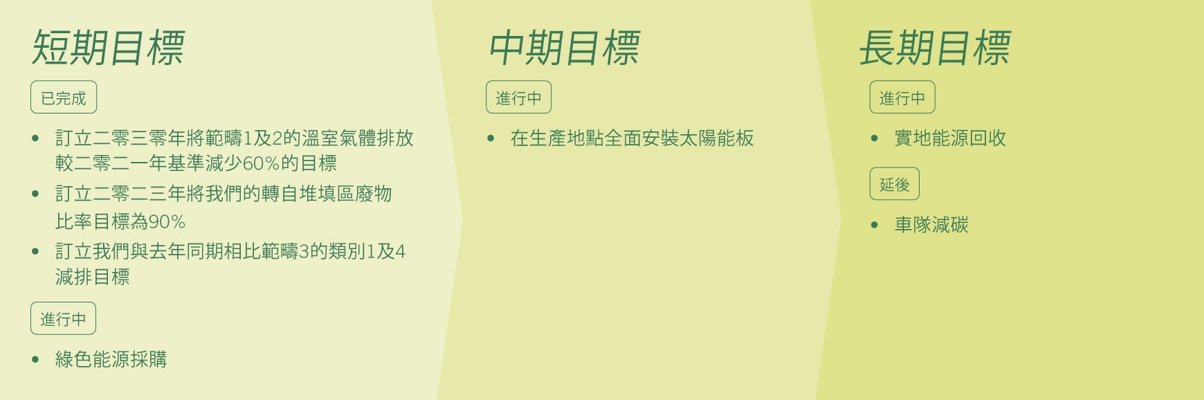 我們的短、中和長期目標正穩步帶領我們實現60%減排目標。在短期方面,我們視實施綠色能源採購策略為優先任務。中期而言,我們將優先開發實地太陽能,此措施已開始在中國的營運中實施。長遠方面,我們計劃擴充現場可再生能源發電規模,並執行能源回收措施。